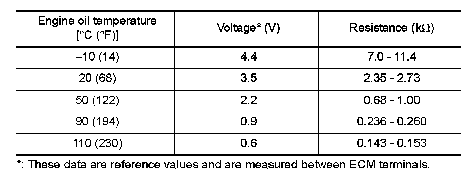 The engine oil temperature sensor is used to detect the engine oil temperature. The sensor modifies a voltage signal from the ECM.