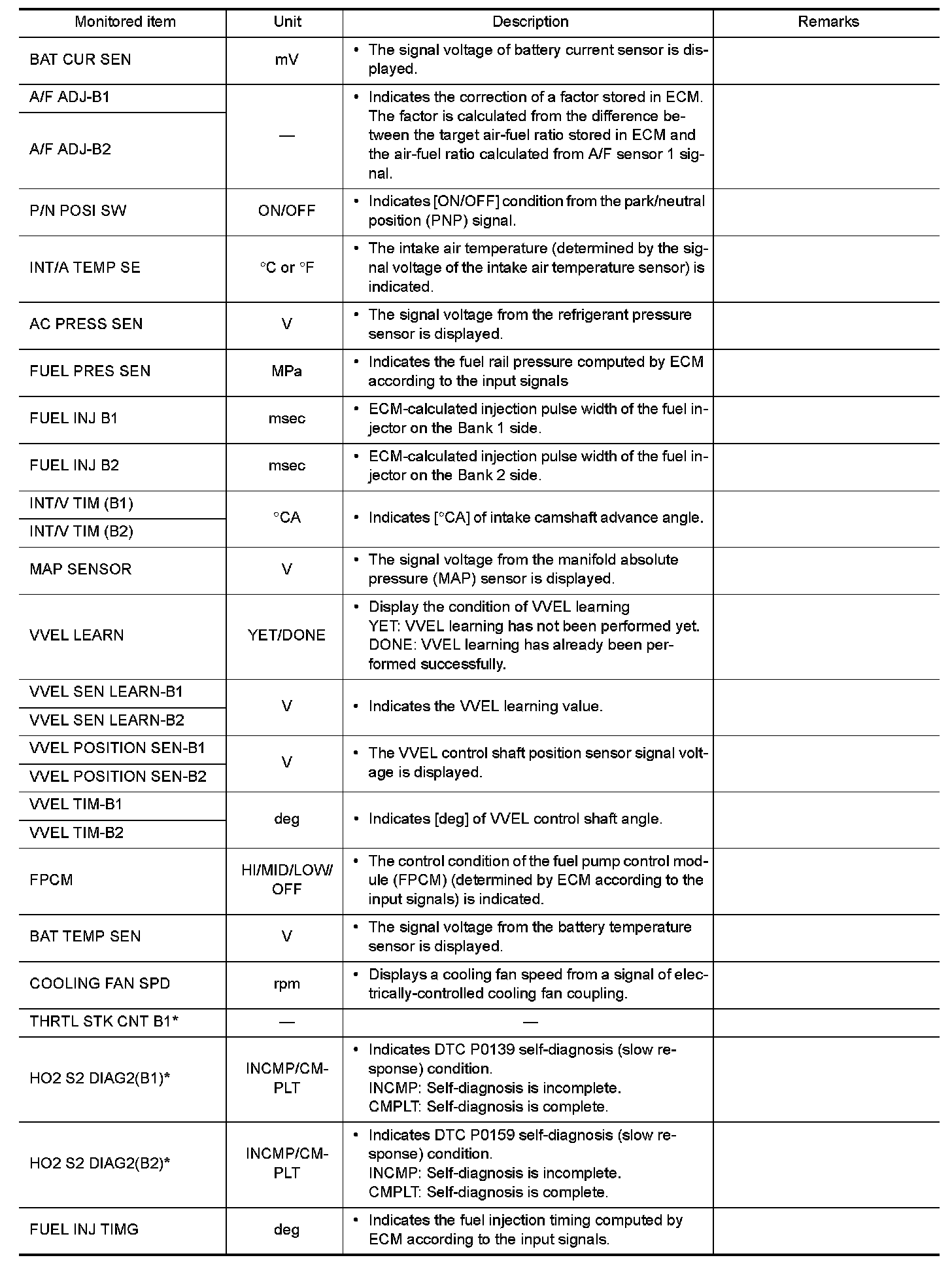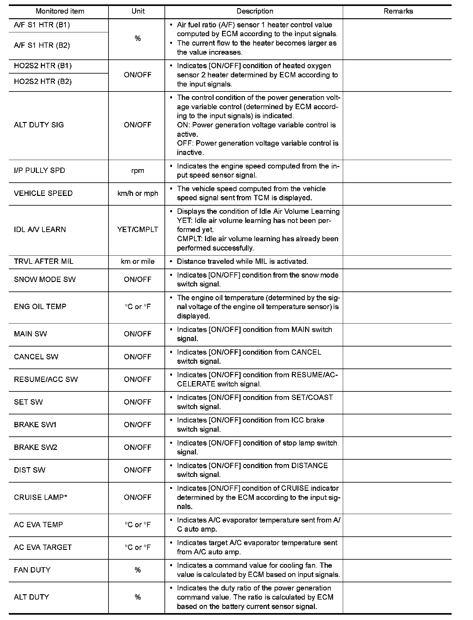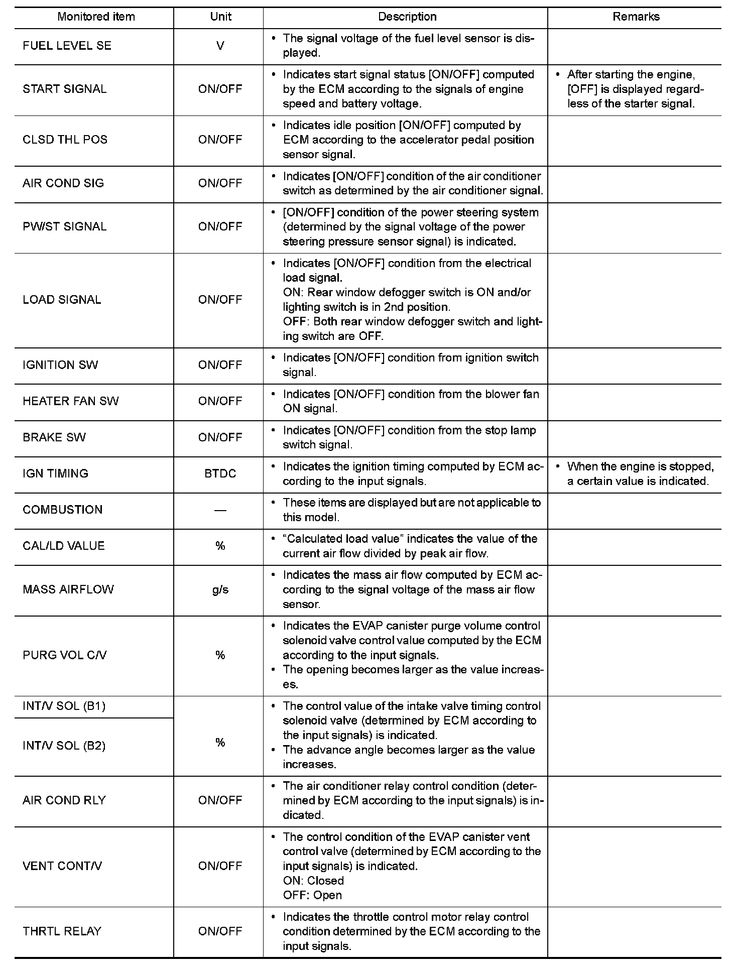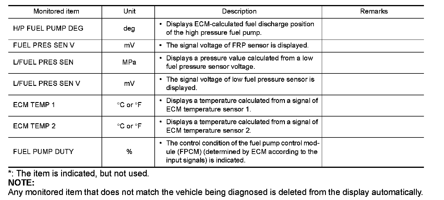 The following table includes information (items) inapplicable to this vehicle. For information (items) applicable to this vehicle, refer to CONSULT display items.