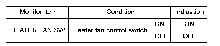Select "HEATER FAN SW" and check indication under the following conditions.