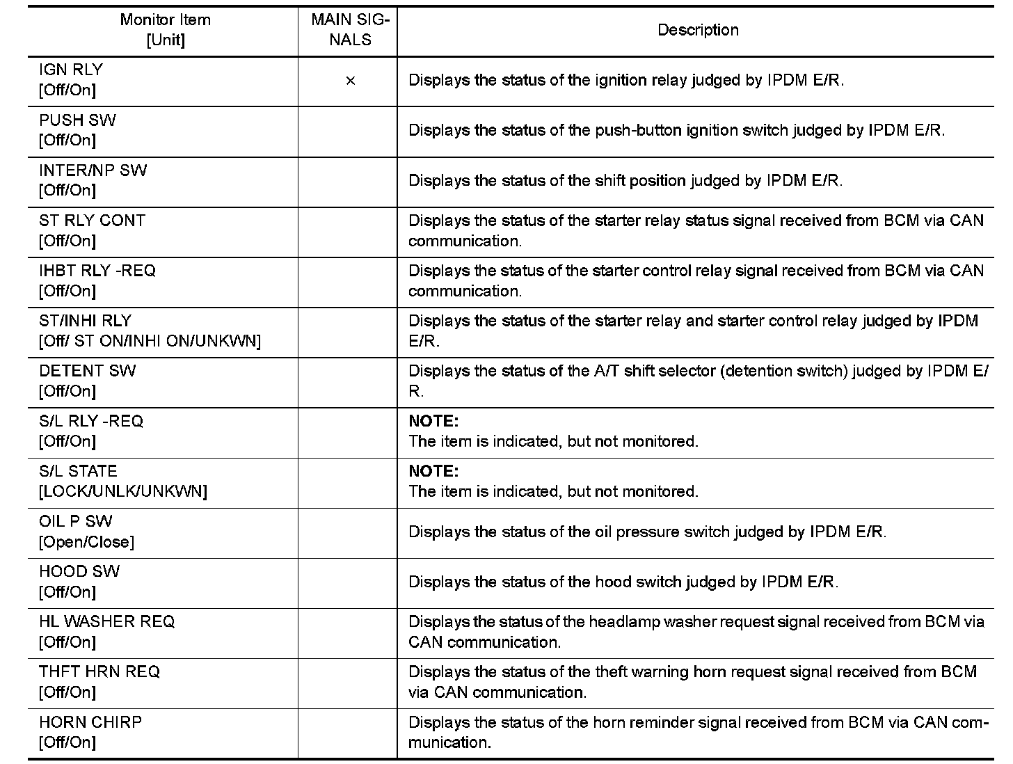 The following table includes information (items) inapplicable to this vehicle. For information (items) applicable to this vehicle, refer to CONSULT display items.