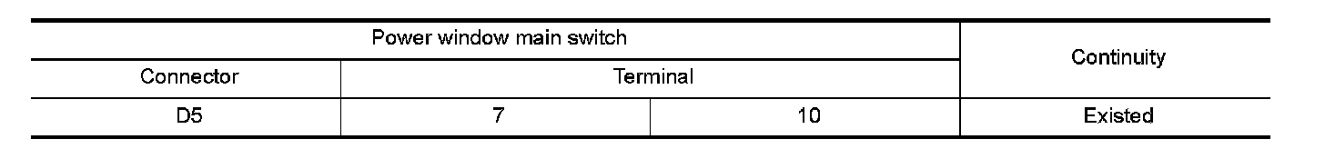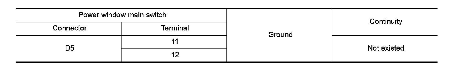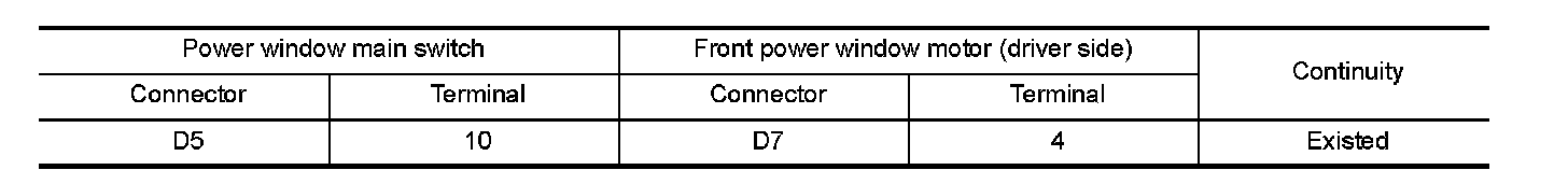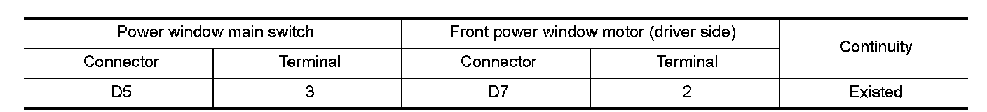 2.Check continuity between power window main switch harness connector and front power window motor (driver side) harness connector.