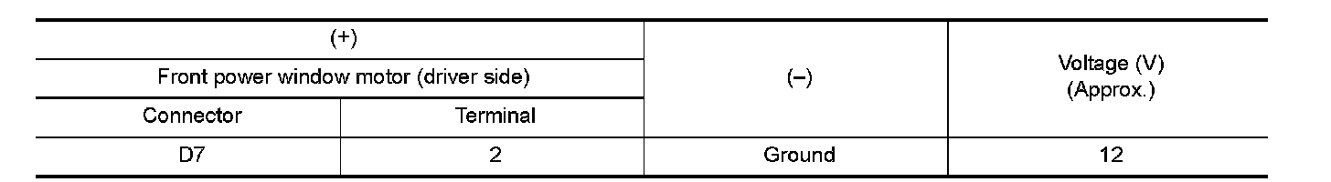 3.Check voltage between front power window motor (driver side) harness connector and ground.