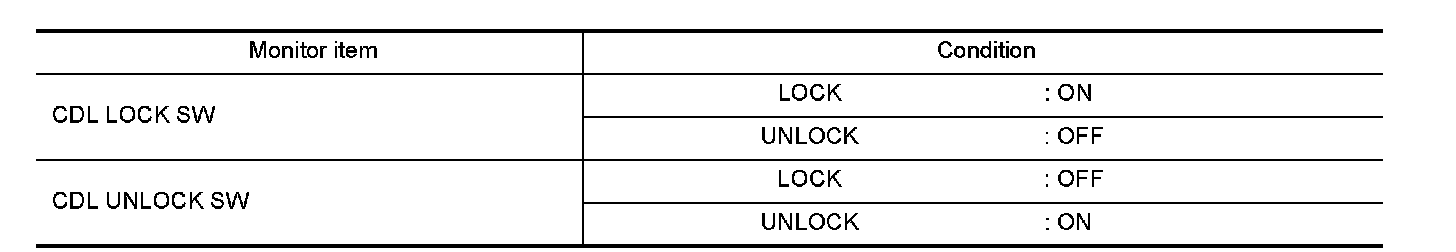 Check ("CDL LOCK SW ", "CDL UNLOCK SW") in "DATA MONITOR" mode for "POWER DOOR LOCK SYSTEM" with CONSULT. Refer to "DOOR LOCK : CONSULT Function (BCM DOOR LOCK)" CONSULT Function.