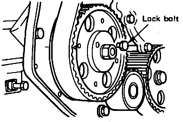 14. Remove injection pump pulley lock bolt and camshaft fixing plate.