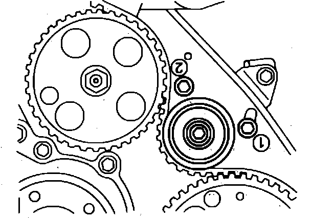 18. Using a belt tension gauge, check tension between camshaft pulley and injection pump pulley. Tension should be 47 to 64 lbs.