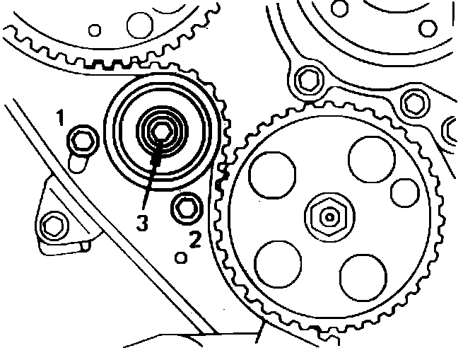 17. Loosen tensioner plate bolts and pulley. Concentrate looseness of belt on tensioner, then tighten the bolts in numerical sequence 1, 2 and 3, Fig. 17. Torque bolts 1 and 2, 11 to 18 ft. lbs. Bolt 3, 47 to 61 ft. lbs.