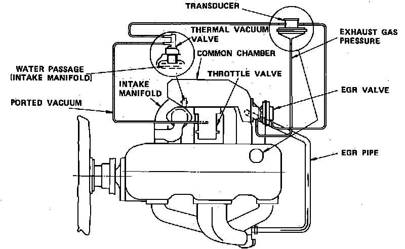 This system, Fig. 29, is used to reduce oxides of nitrogen emissions by lowering the peak combustion temperature in the engine. This is accomplished by introducing a metered amount of exhaust gasses into the intake manifold at speeds above idle.