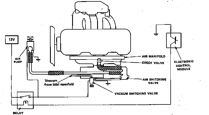 The air pump passes air through the air switching valve and check valve, then into the air manifold. As hot exhaust gases leave the combustion chamber, it meets with air from the air injection nozzle located in the exhaust port to burn some part of the hydrocarbons and carbon monoxide.