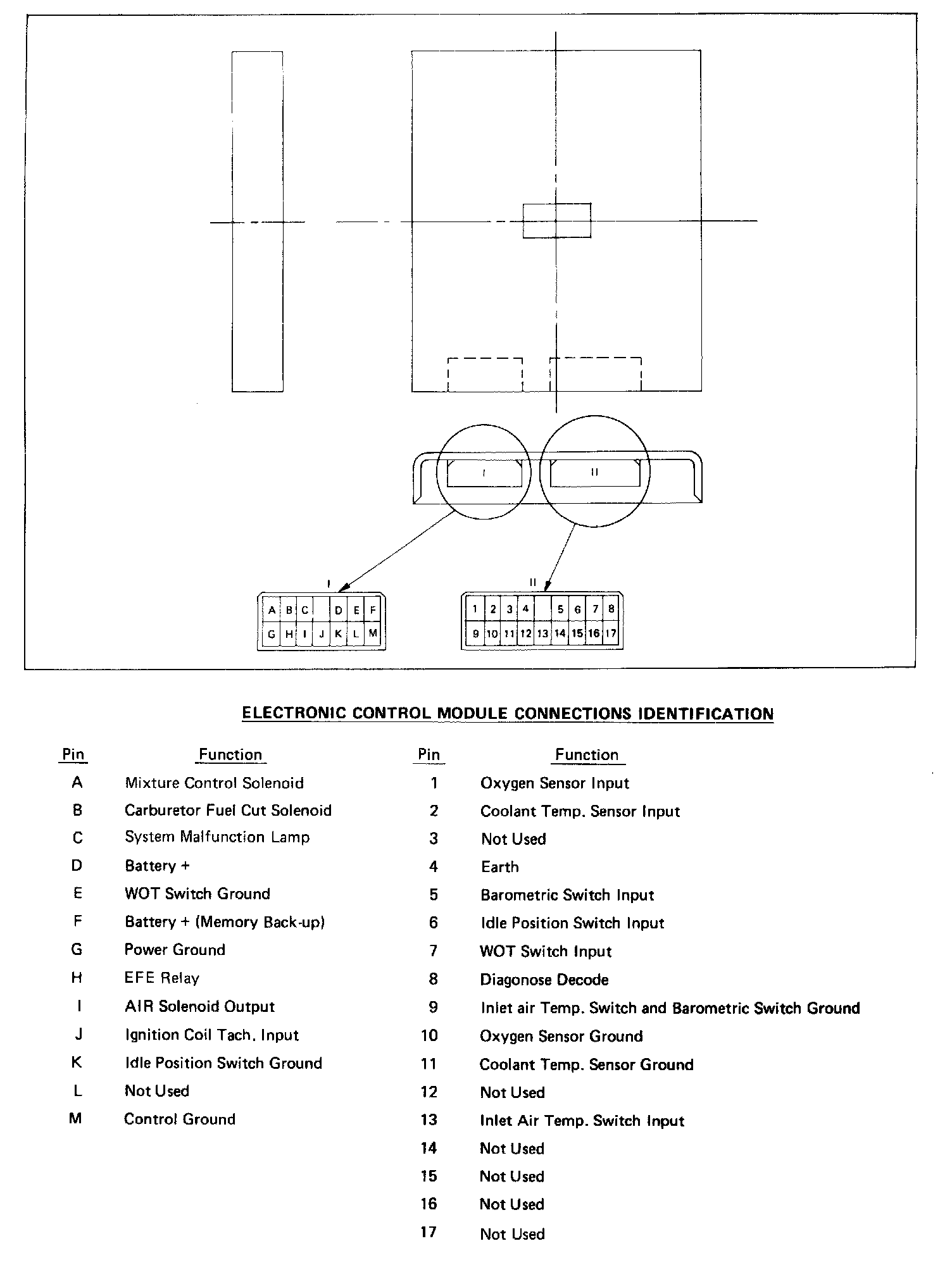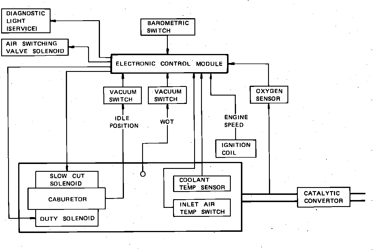 The Closed Loop Emission Control System, Fig. 2 is used on all California Trooper II models. The system is used to provide precise control of the air/fuel mixtures, allowing use of a dual bed 3-way catalytic converter and to control air flow in the AIR system. System components include an electronic Control Module (ECM), oxygen sensor, vacuum fuel control valve and duty solenoid, electronically controlled carburetor and other sensors and actuators. The three-way catalytic converter is also considered part of this system.