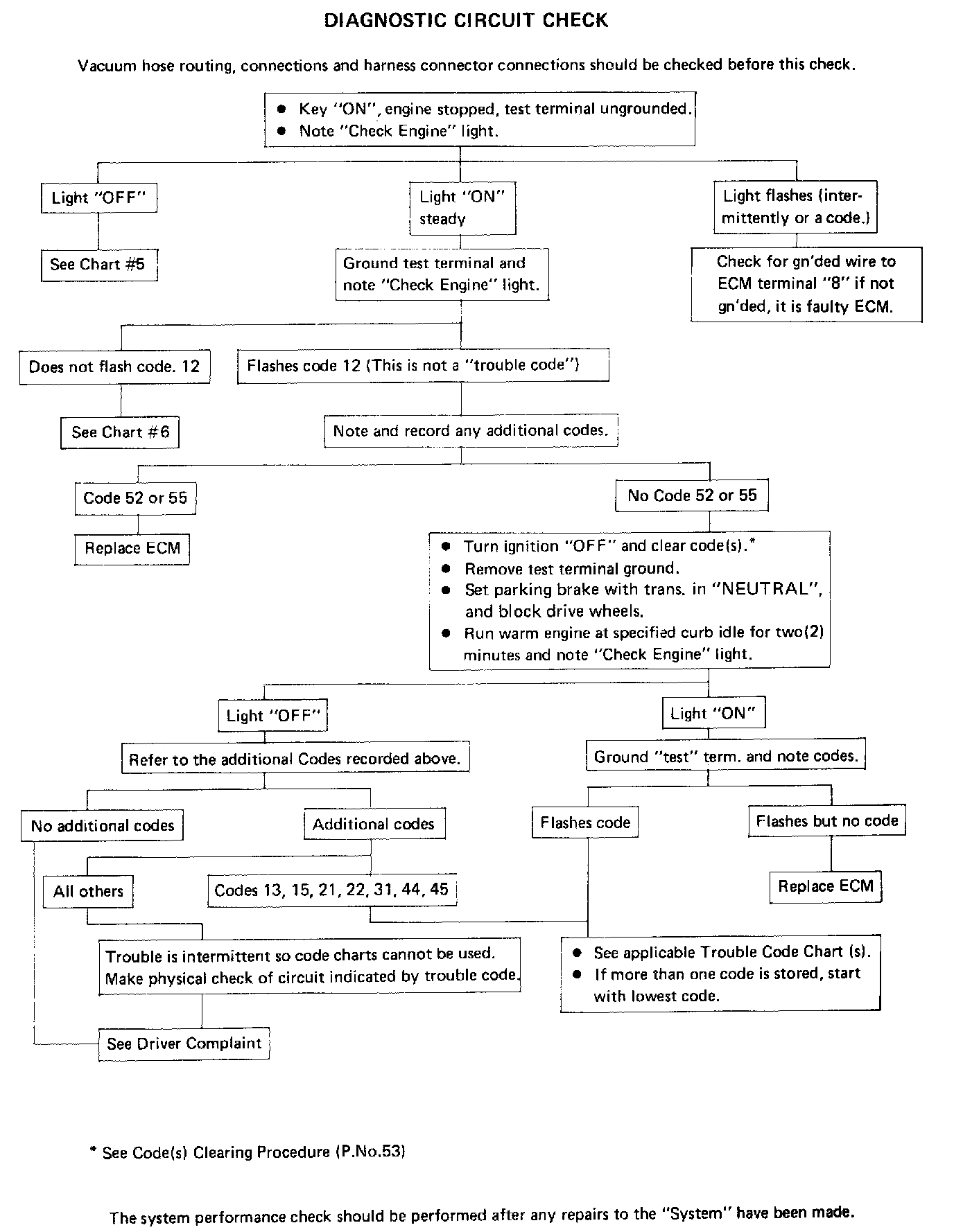 The Diagnostic Circuit Check (Fig. E-2) makes sure that the self-diagnostic system works, determines that the trouble codes will display and guides diagnosis to other problem areas.
