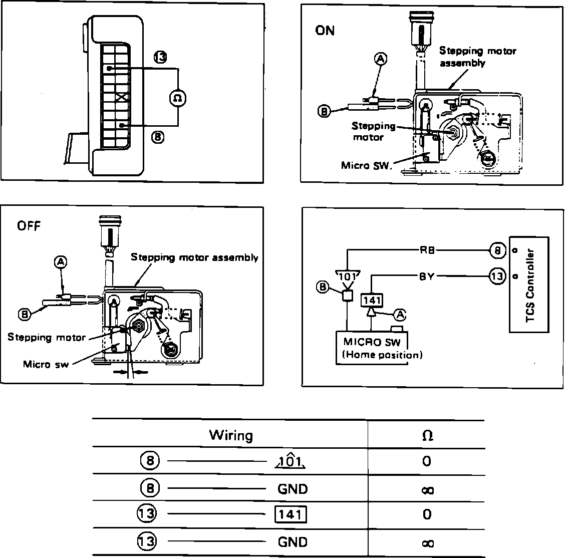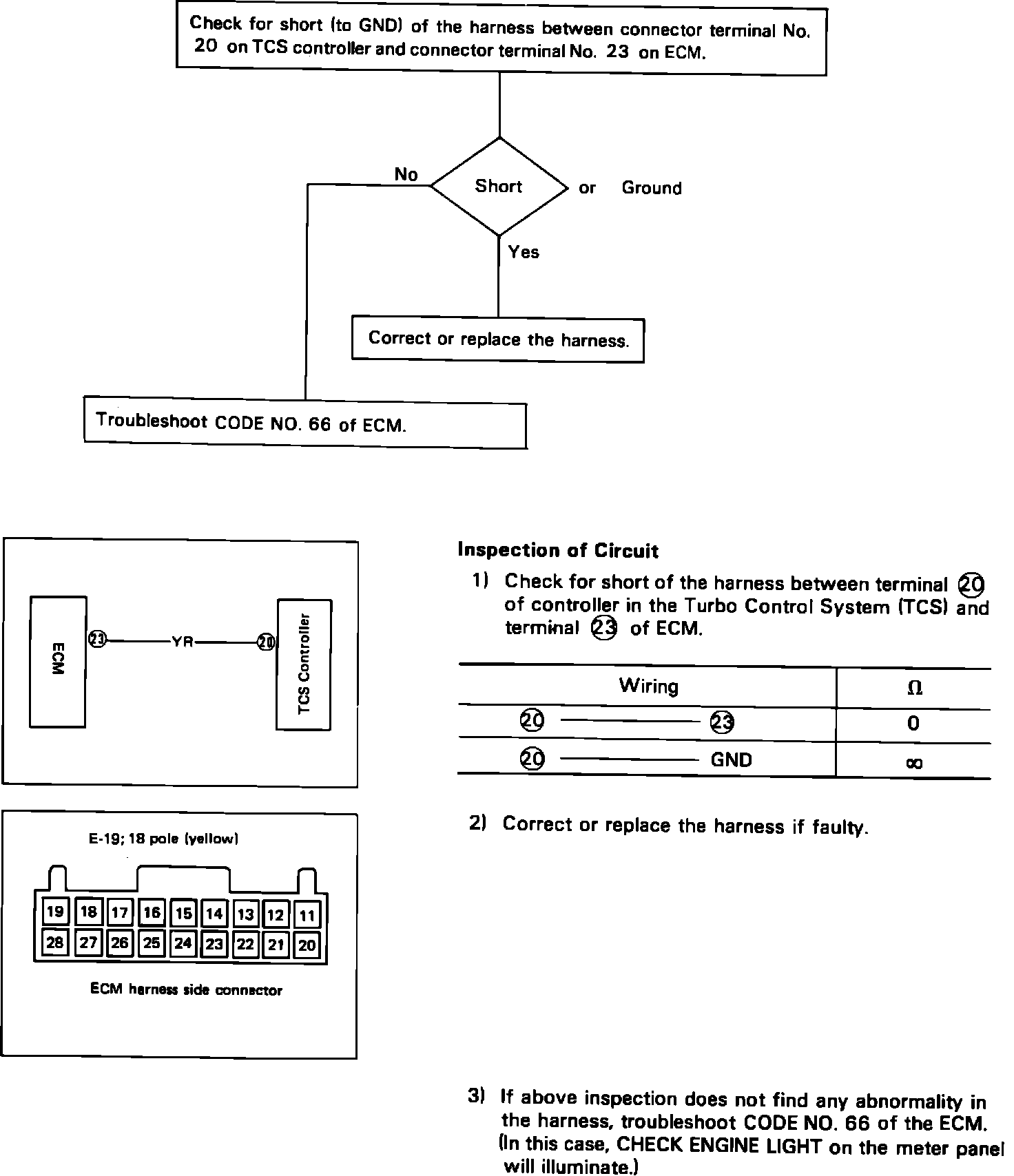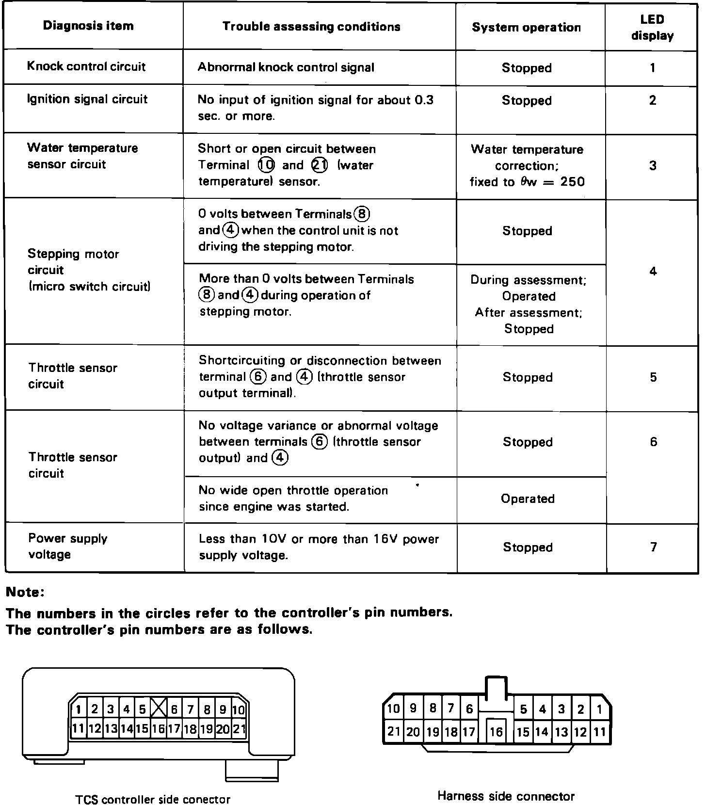 In addition to the ECM, this engine control system incorporates a separate Turbocharger Control System (TCS) control unit. The TCS control unit utilizes signals from various sensors, including the knock signal from the ECM, to calculate turbocharger operation. To regulate turbo output, the TCS control unit signals a stepping motor which opens and closes the turbo wastegate valve as directed. The TCS control unit has a self diagnosis system from which trouble codes can be extracted via an LED display.
