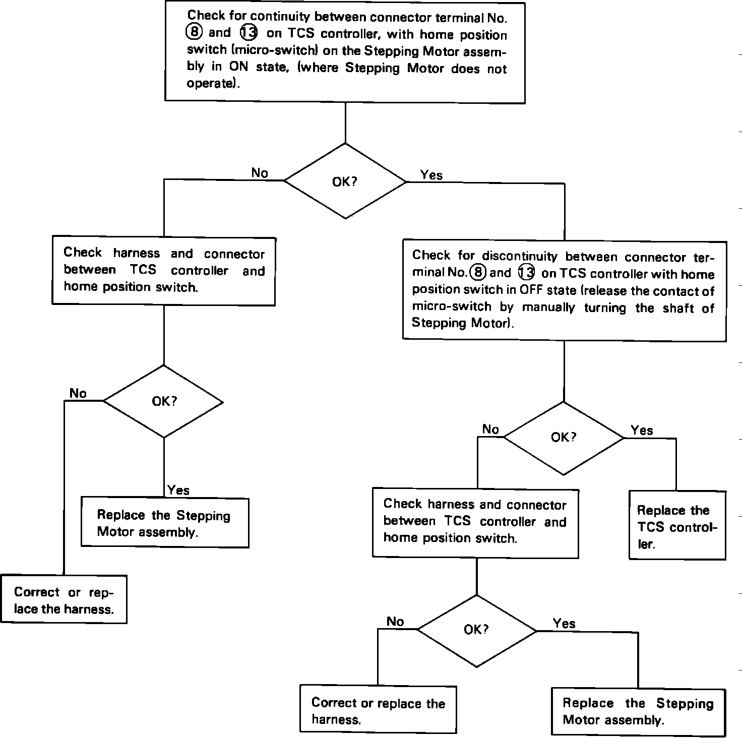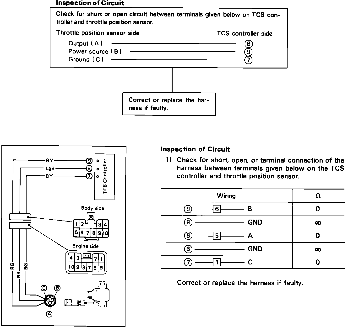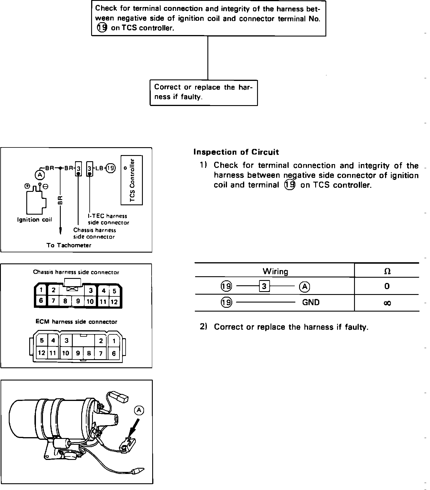 In addition to the ECM, this engine control system incorporates a separate Turbocharger Control System (TCS) control unit. The TCS control unit utilizes signals from various sensors, including the knock signal from the ECM, to calculate turbocharger operation. To regulate turbo output, the TCS control unit signals a stepping motor which opens and closes the turbo wastegate valve as directed. The TCS control unit has a self diagnosis system from which trouble codes can be extracted via an LED display.