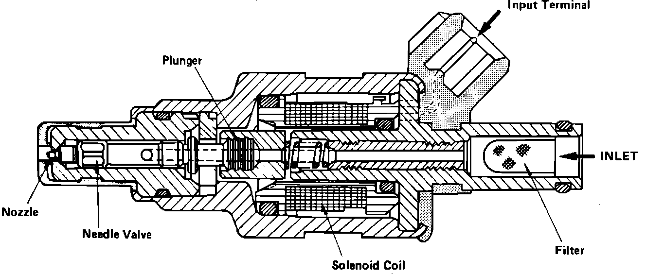 The injectors are "ON/OFF" solenoid valves installed one per cylinder on the intake manifold. The ECM sends pulses to energize (open) the injectors for varying lengths of time depending on its fuel requirement calculations, thereby controlling air/fuel ratio under a wide range of operating conditions.