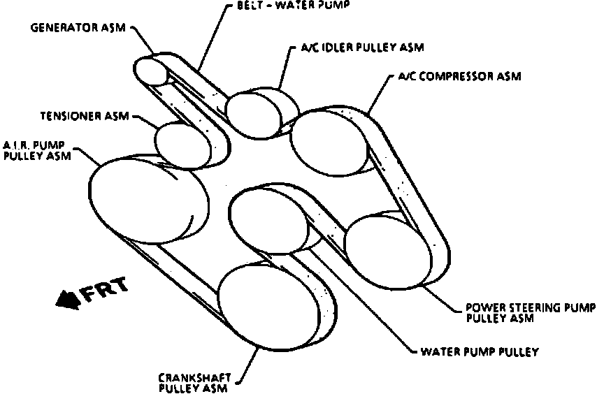 Install a serpentine belt following the belt routing in figure. The grooves in the belt must match the grooves in the pulleys. The tensioner is spring loaded. After removing the belt, the tensioner will return the tension position.