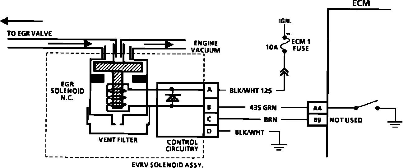 1. With ignition "ON" and engine "OFF," the electronic vacuum regulator valve (EVRV) should not be energized. Apply vacuum to intake manifold side of EVRV. No vacuum should be able to pass to the EGR valve.