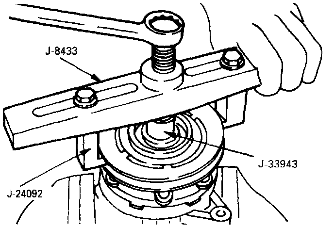 - Using pulley puller pilot (J-33943), pulley puller (J-8433) and pulley puller leg (J-24092) to remove the magnetic clutch pulley.