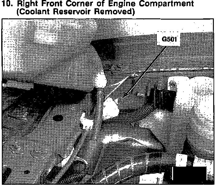 On R.F fender apron, behind coolant reservoir.