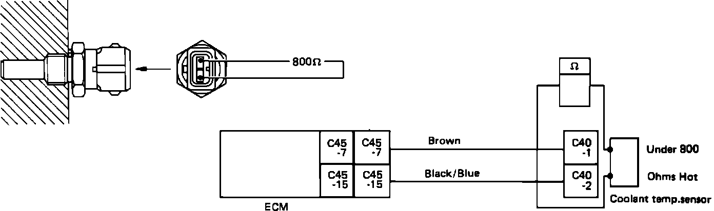 Check resistance between coolant sensor terminals. It should be less than 800 ohms with a warm engine.