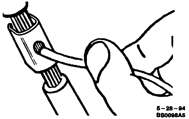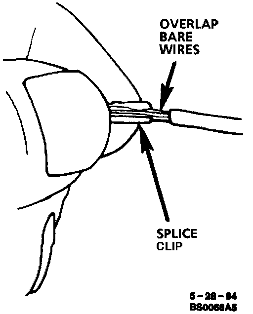 Select the proper clip to secure the splice. To determine the proper clip size for the wire being spliced, follow the directions included in the J 38125-A Terminal Repair Kit. Select the correct anvil on the crimper. (On most crimpers your choice is limited to either a small or large anvil.) Overlap the stripped wire ends and hold them between your thumb and forefinger as shown. Then, center the splice clip under the stripped wires and hold it in place.