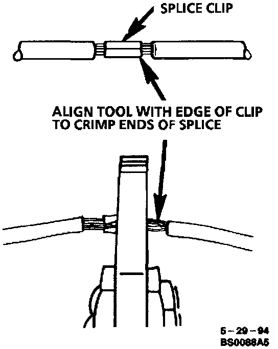 Crimp the splice again, once on each end. Do not let the crimping tool extend beyond the edge of the clip or you may damage or nick the wires.