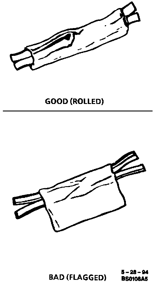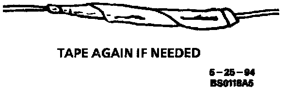 Center and roll the splicing tape. The tape should cover the entire splice. Roll on enough tape to duplicate the thickness of the insulation on the existing wires. Do not flag the tape. Flagged tape may not provide enough insulation, and the flagged ends will tangle with the other wires in the harness.