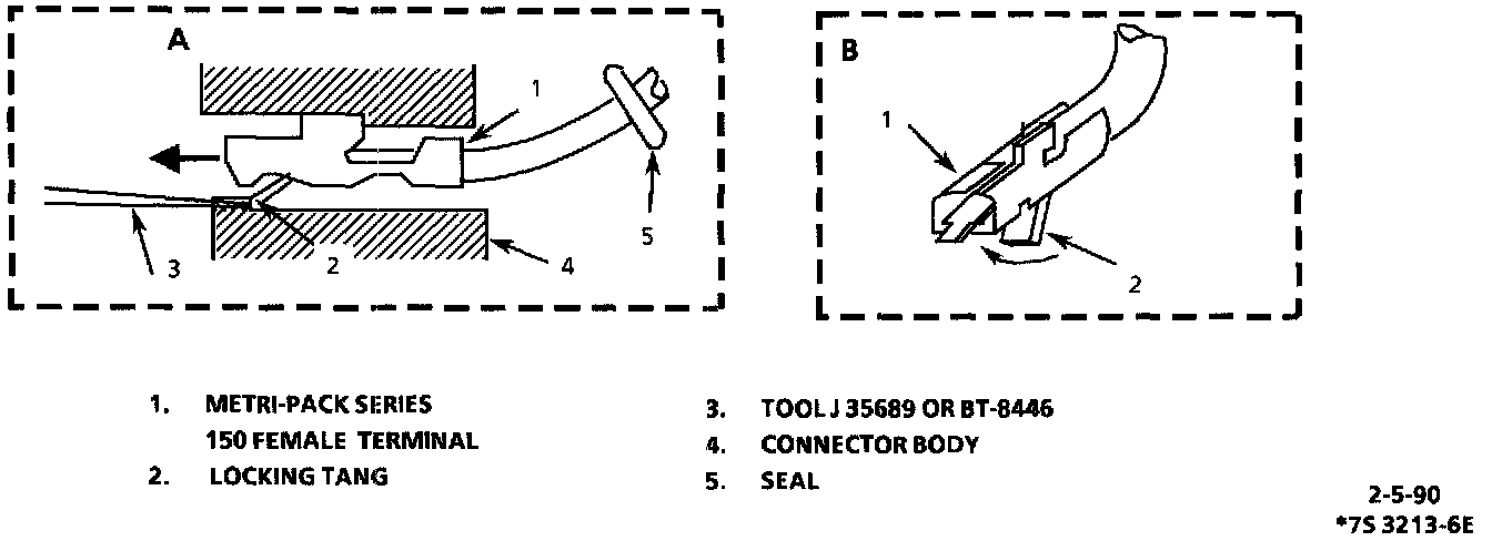 Metri-Pack terminals are also referred to as "Pull-To-Seat' terminals, because to install a terminal on a wire, the wire must be inserted through the seal (5) and connector (4).The terminal is then crimped onto the wire. Then the terminal is pulled back into the connector to seat it in place. To remove a terminal, follow these steps: