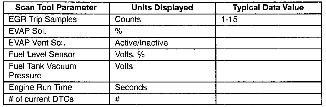 The EVAP Solenoid hen energizes allows fuel vapor to flow from the EVAP canister to the engine. The EVAP valve is normally closed and is pulse width modulated by the PCM to control vapor flow. The EVAP valve will read 0% when closed to 100% when fully opened.