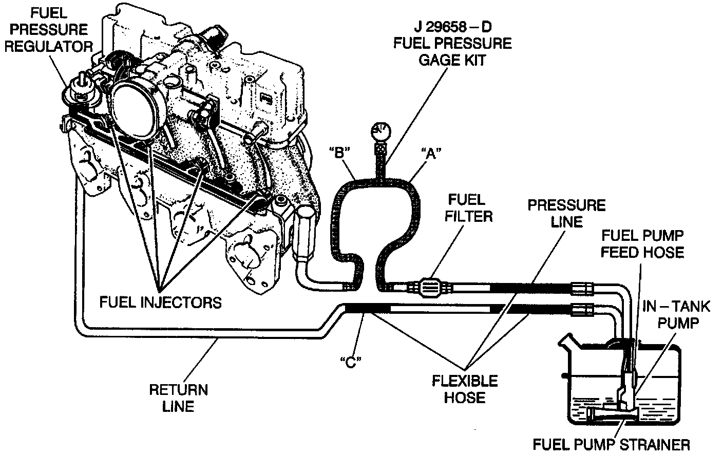 The in-tank fuel pump is an electric pump within an integral reservoir. The in-tank fuel pump supplies fuel through an in-line fuel filter to the fuel passage within the lower manifold assembly. The fuel pump is designed to provide fuel at a pressure above the pressure needed by the fuel injectors. A fuel pressure regulator, attached to the lower manifold assembly, keeps the fuel available to the fuel injectors at a regulated pressure. Unused fuel is returned to the fuel tank by a separate fuel return pipe.