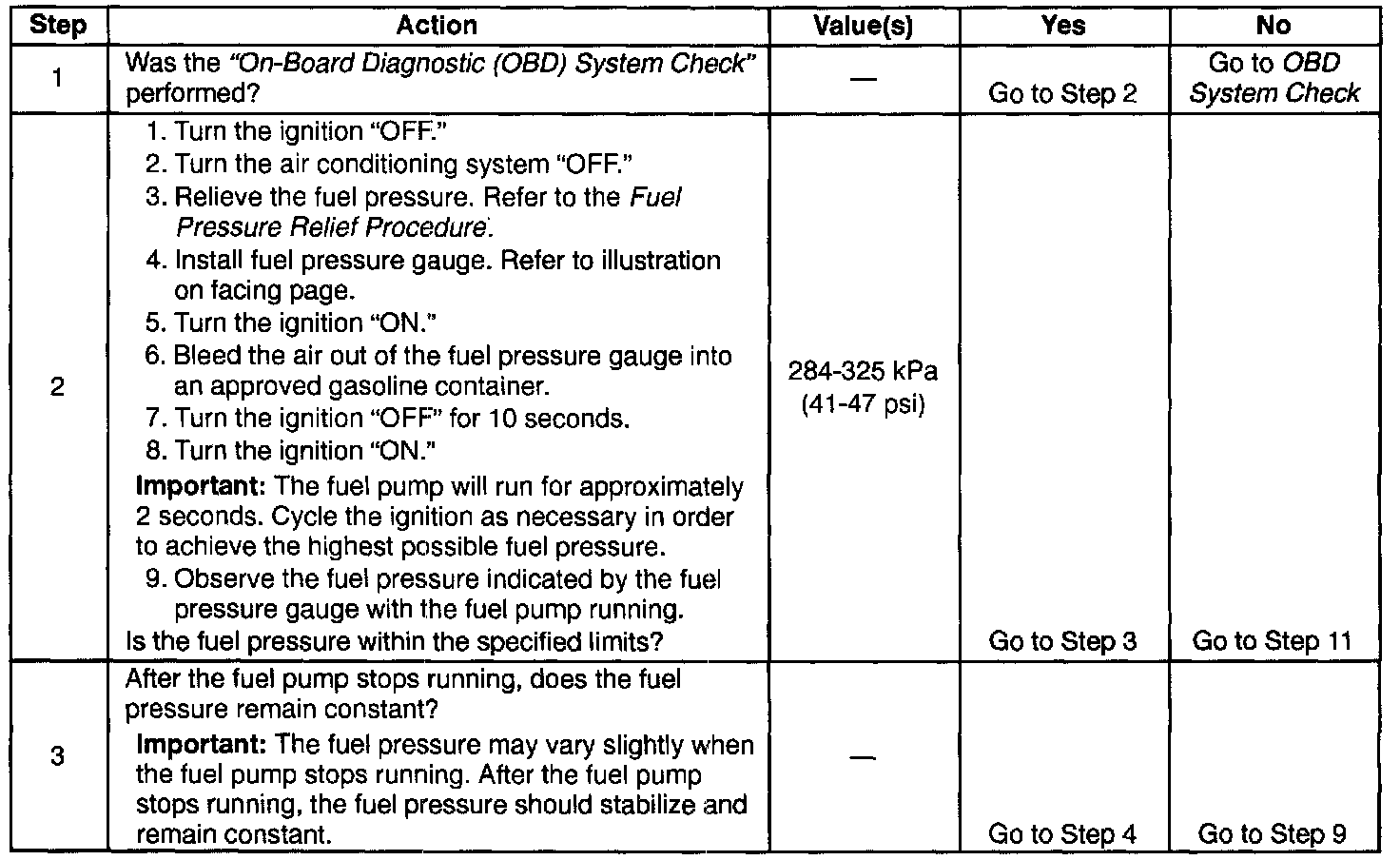 15. A lean condition may result from the fuel pressure being below 284 kPa (41 psi). A lean condition may cause a DTC P0131 or a DTC P0171 to set. Driveability conditions associated with lean conditions can include hard starting (when the engine is cold), hesitation, poor driveability, lack of power, surging, and misfiring.