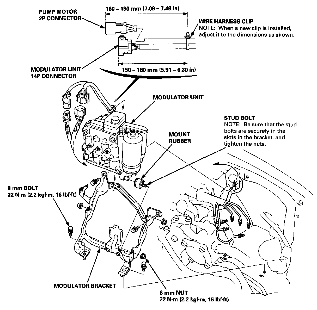 NOTE: When a new harness clip is installed after a wire harness or modulator unit replacement, adjust the harness clip to the dimensions shown below.