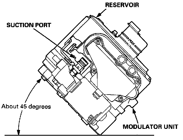 2. Before installing the modulator unit on the car, be sure to bleed the air from the suction port in the modulator unit by leaning the modulator unit to one side slowly (about 45 degrees) as shown.