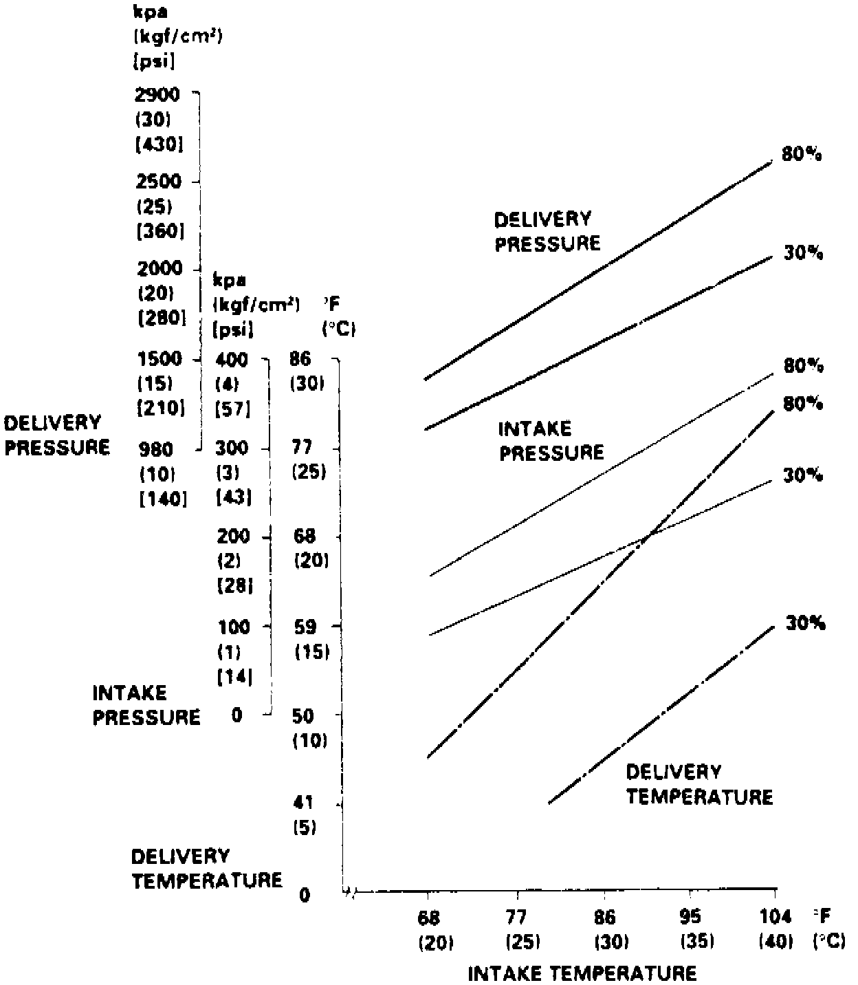 4. Using appropriate chart, Fig. 6, mark delivery temperature along vertical line, then intake temperature (ambient air temperature) along bottom line.
