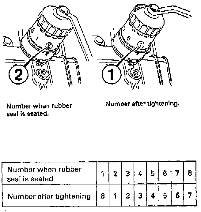 2) Tighten the filter by turning it clockwise seven numbers from the marked point. For example, if a mark is made under the number 2 when the rubber seal is seated, the filter should be tightened until the number 1 comes up to the marked point.