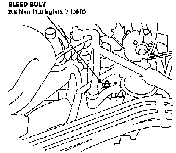 8. Loosen the air bleed bolt in the thermostat housing, then fill the radiator to the bottom of the filler neck with the coolant mixture. Tighten the bleed bolt as soon as coolant starts to run out in a steady stream without bubbles.