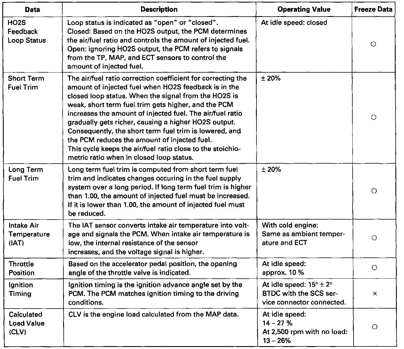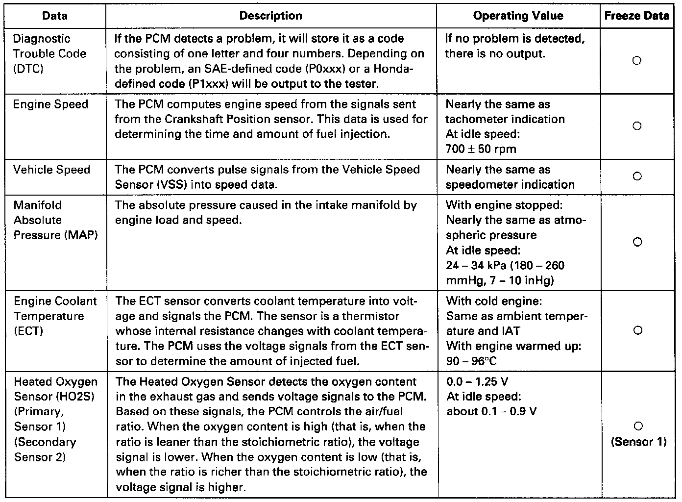 By connecting the OBD II scan tool or the Honda PGM Tester to the 16P data link connector (DLC), various data can be retrieved from the PCM. The items listed in the table below conform to the SAE recommended practice. The Honda PGM Tester also reads data beyond that recommended by SAE. Understanding this data will help to find the causes of intermittent failures or engine problems.