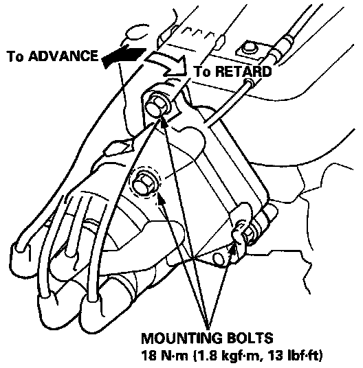 1. To adjust ignition timing, loosen the distributor mounting bolts, and turn the distributor ignition (DI) housing counterclockwise to advance the timing, or clockwise to retard the timing.