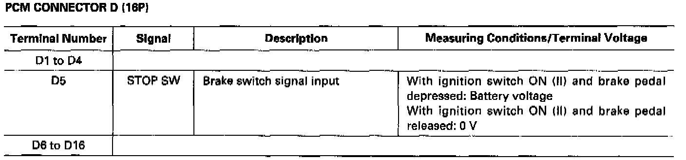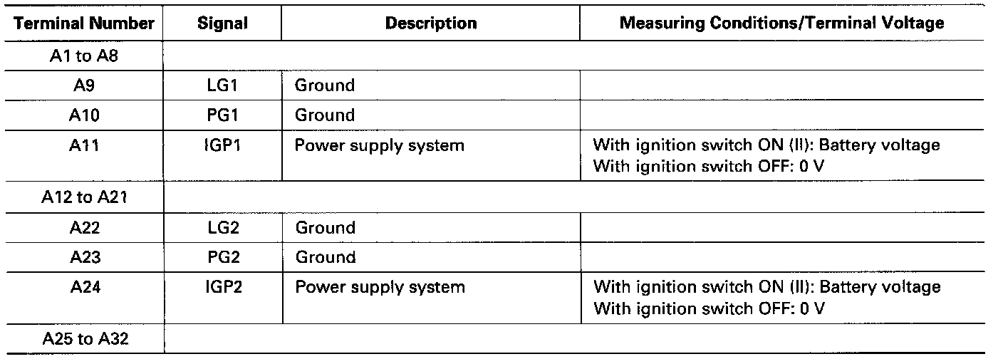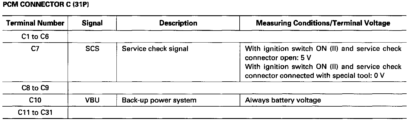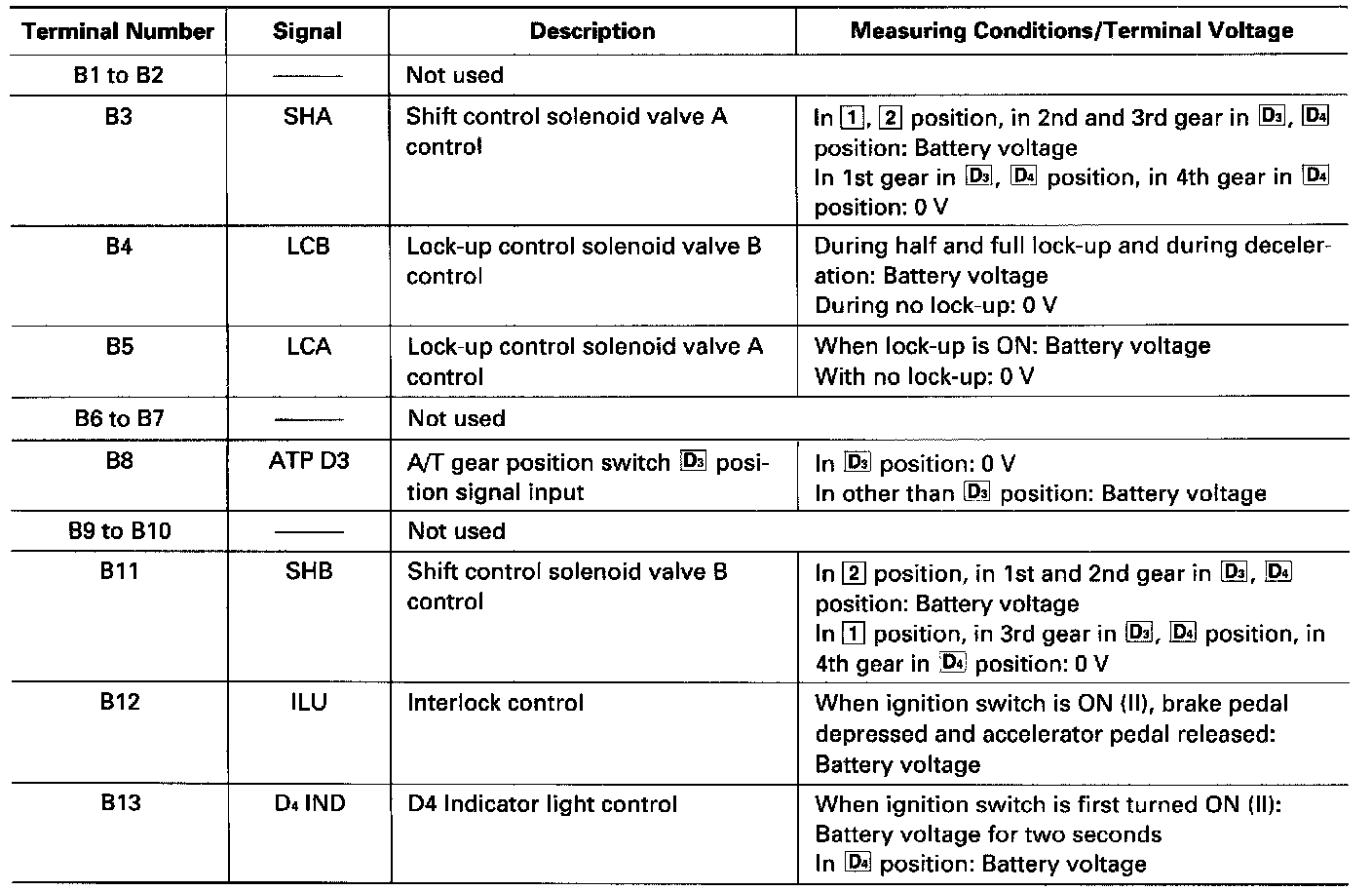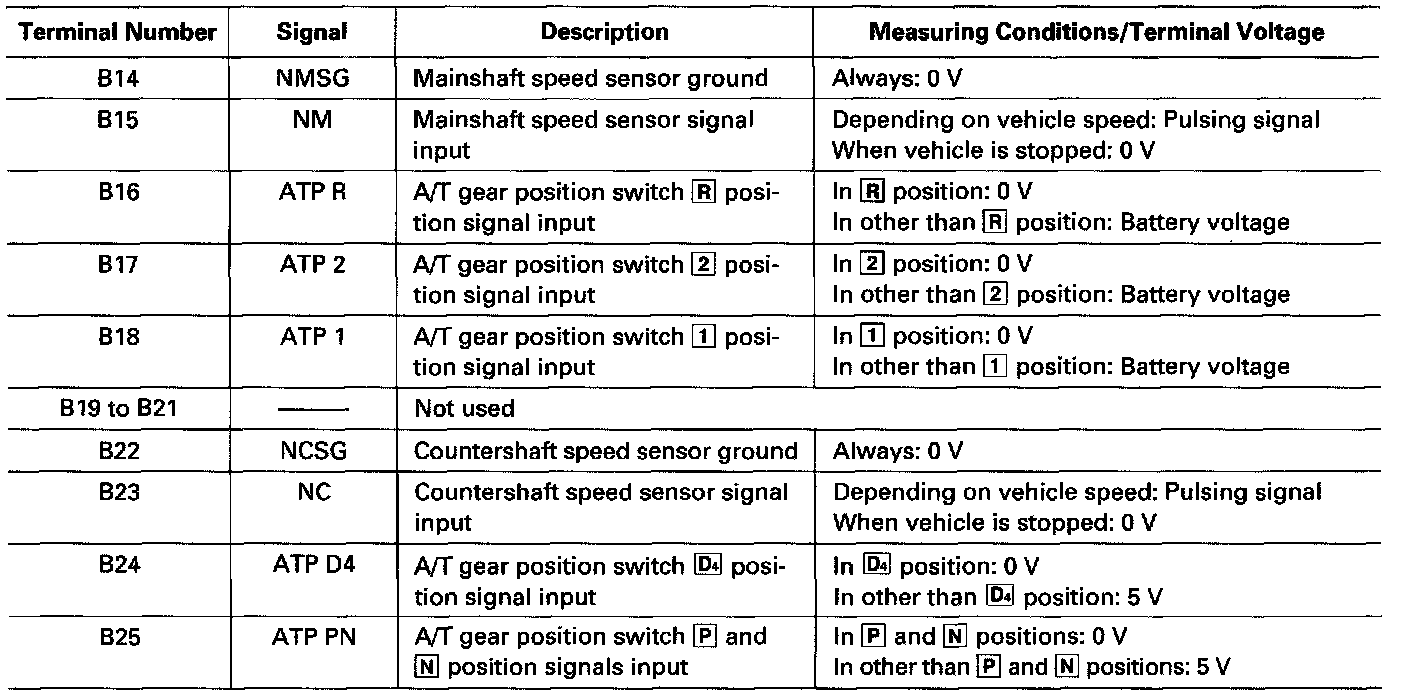 The PCM terminal voltage and measuring conditions are shown for the connector terminals that are related to the A/T control system. The other PCM terminal voltage and measuring conditions are described under Computers and Control Systems.