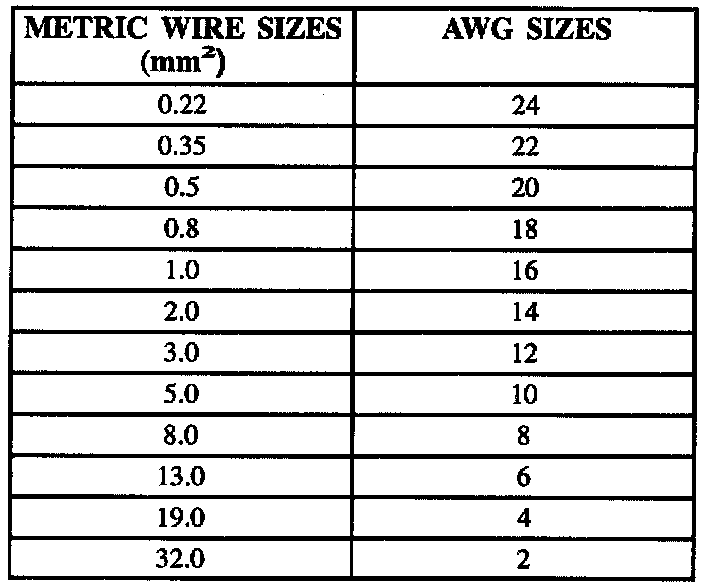 when replacing a wire, use a wire of the same size as the original wire or larger. The schematics list wire size in metric units. The following table shows the commercial (AWG) wire sizes that can be used to replace each metric wire size. Each AWG size is either equal to or larger than the equivalent metric size.