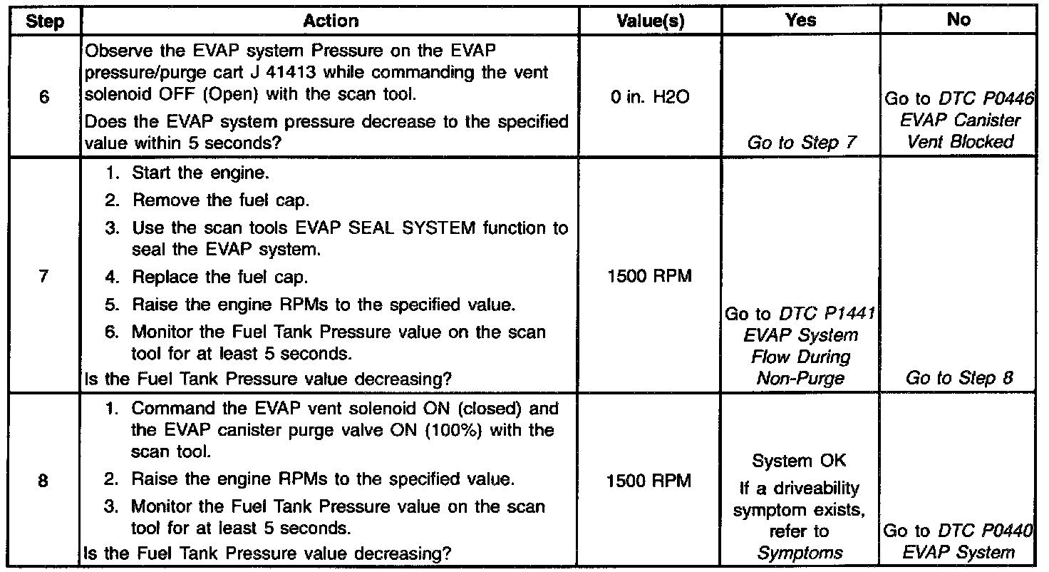 Applying a vacuum to the EVAP system and monitoring for a vacuum decay checks the evaporative emission system. The Control Module monitors the vacuum level through the fuel tank vacuum sensor signal. At an appropriate time, the EVAP canister purge valve and the EVAP vent solenoid turn ON, allowing the engine to draw a small vacuum on the entire evaporative emission system. After the desired vacuum level has been achieved, the EVAP canister purge valve turns OFF, sealing the system. A leak is detected by monitoring for a decrease in the vacuum level over a given time period, when all other variables remain constant. A leak, a blockage or a malfunctioning component in the system causes a DTC to set.