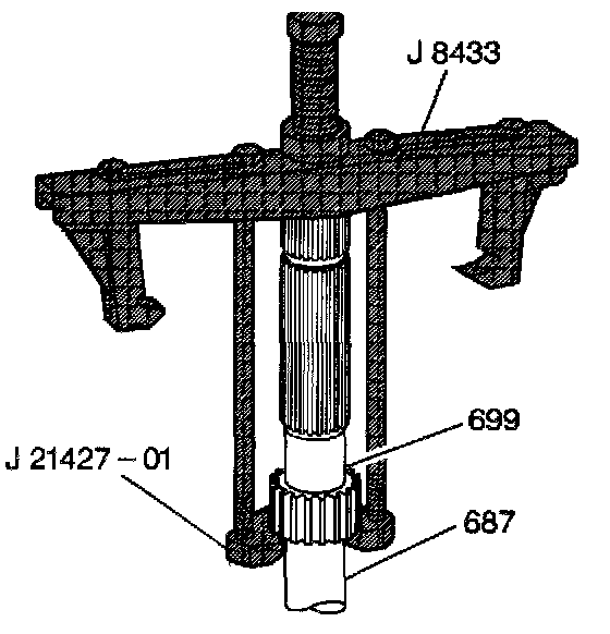 5. Using J8433 with J21427-01, remove the internal speed sensor rotor (699) from the output shaft (687).