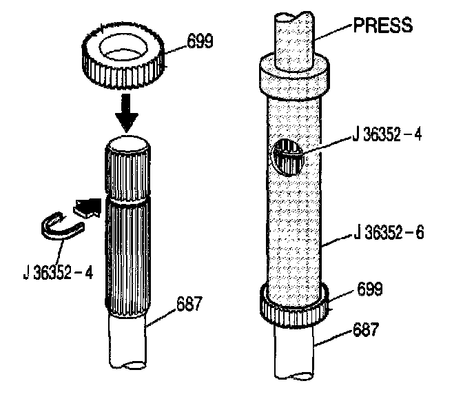 3. Place the J36352-6 on the output shaft (687). Press on the J36352-6 until it contacts the J36352-4 in the window (the J36352-4 will be a positive stop for the J36352-6).