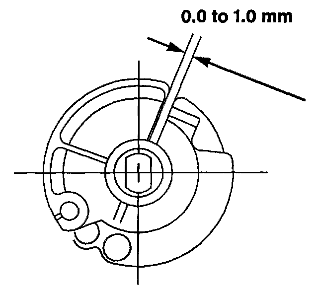 2. Adjust the length of the cruise control cable until there is a clearance of 0.0 to 1.0 mm (0.0 to 0.04 inch) between the cruise control cable and accelerator cable throttle lever cams, as shown.