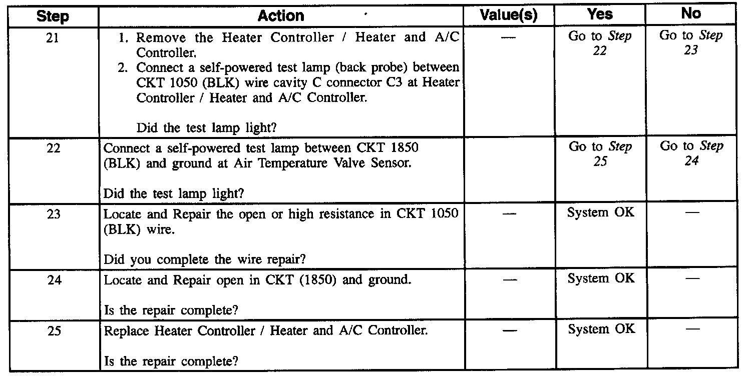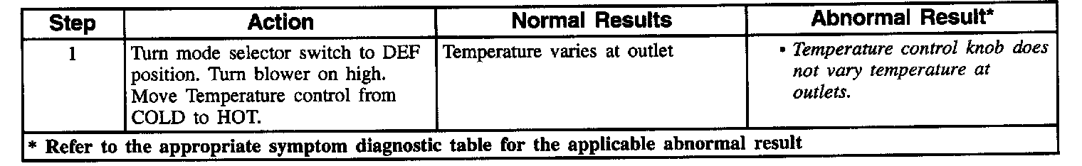 The Air Temperature Valve Sensor positions the temperature door according to the temperature setting of the temperature control on the temperature control /mob. For the full cold temperature setting, the temperature control returns approximately 1.0 Volt to the Air Temperature Valve Sensor. When the temperature setting is changed to full HOT, the temperature door is moved to the warm position, and the output rises to about 12 Volts. For a temperature setting in the mid range, the temperature door positions itself according to the voltage supplied through the temperature control switch. Should the motor stall when changing the door location, voltage is removed by the Heater Controller / Heater and A/C Controller after 45 seconds to protect the motor.