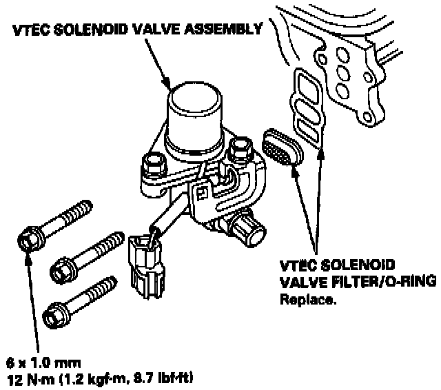 3. If the resistance is within specifications, remove the VTEC solenoid valve assembly from the cylinder head, and check the VTEC solenoid valve filter/Oring for clogging.