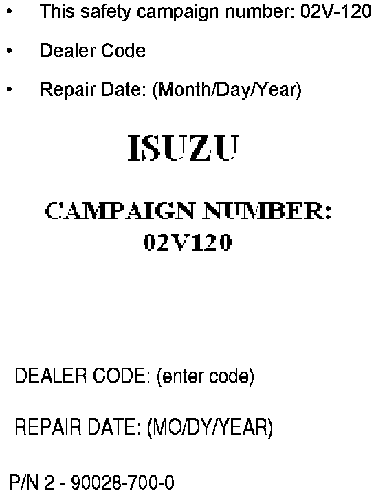 Isuzu dealers must service all affected vehicles at no charge to the owner, regardless of mileage, age of vehicle, or ownership.