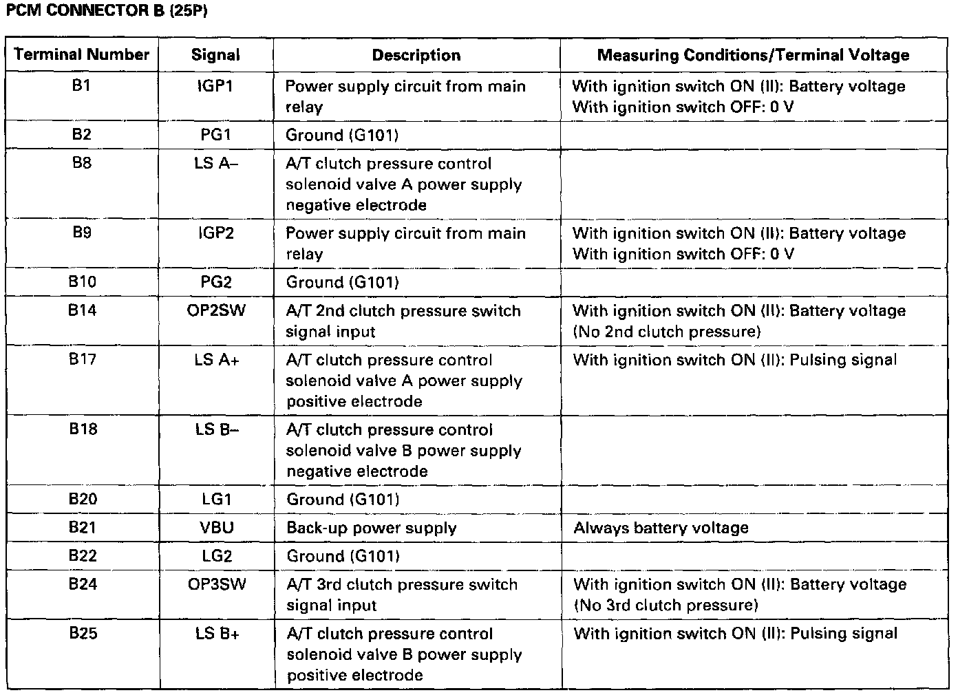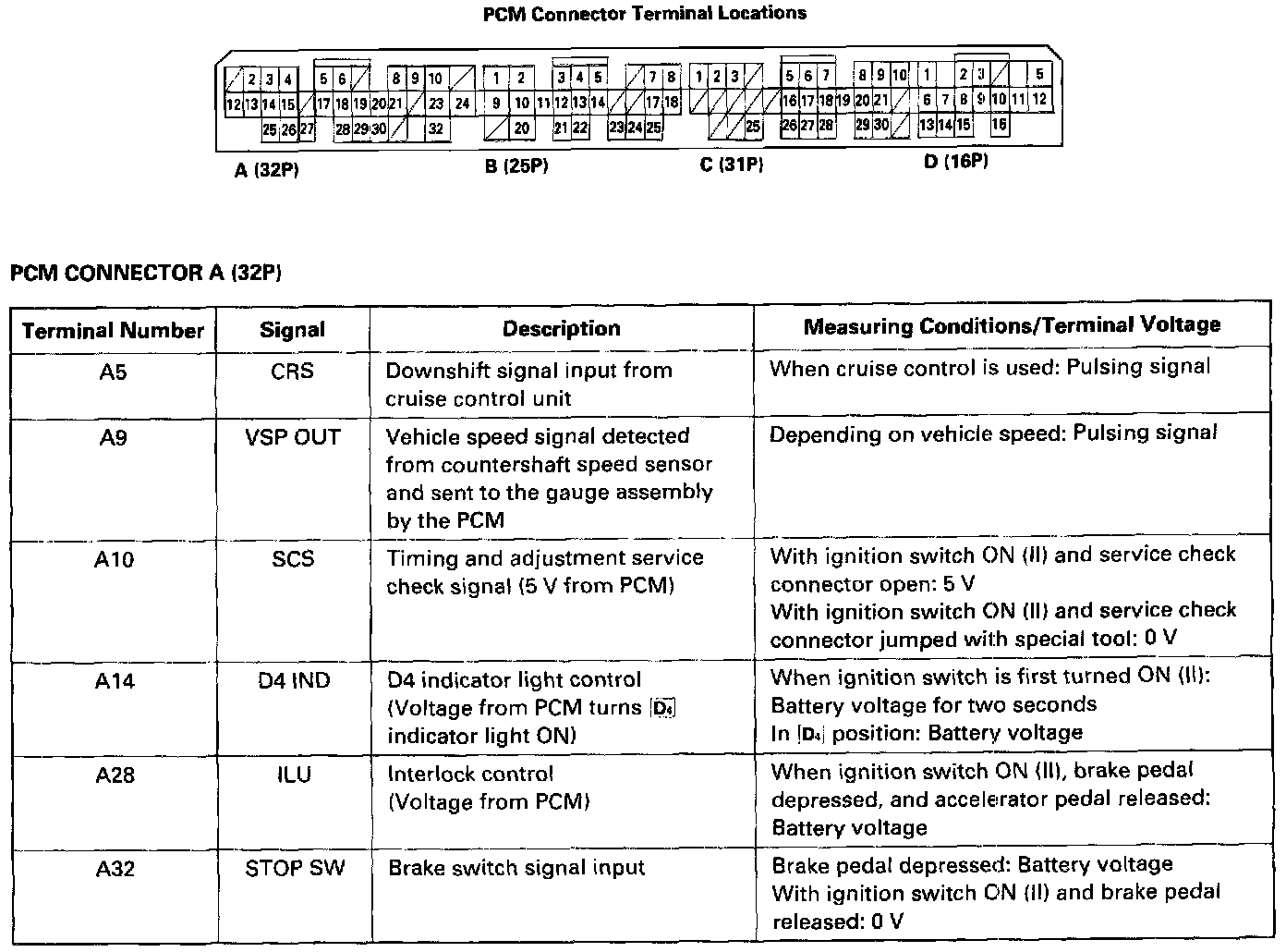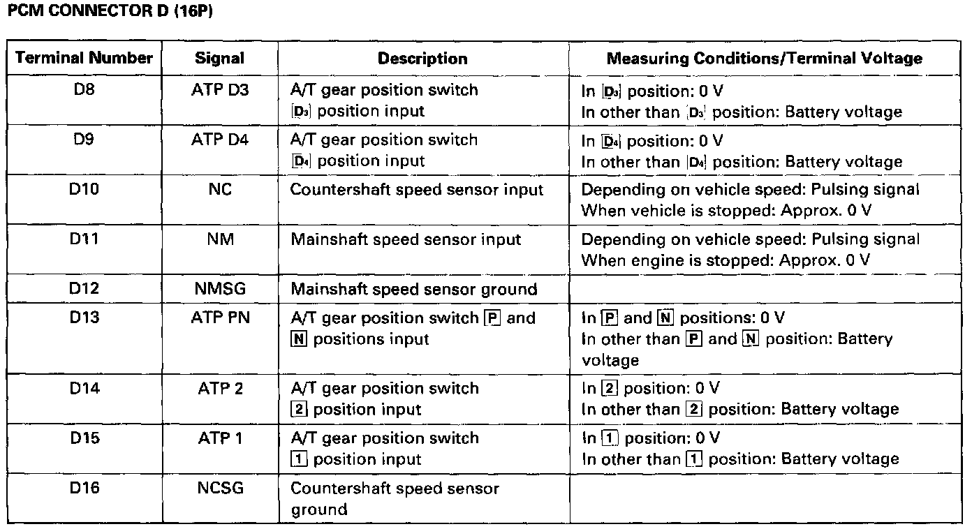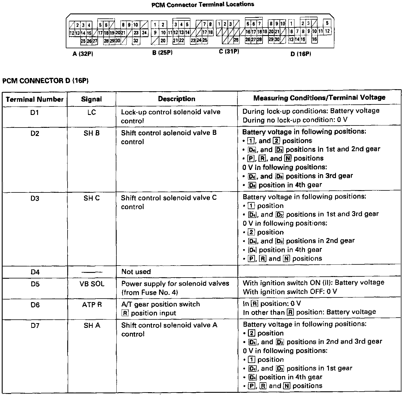 The PCM terminal voltage and measuring conditions are shown for the connector terminals that are related to the A/T control system. The other PCM terminal voltage and measuring conditions are described in Computers and Control Systems.