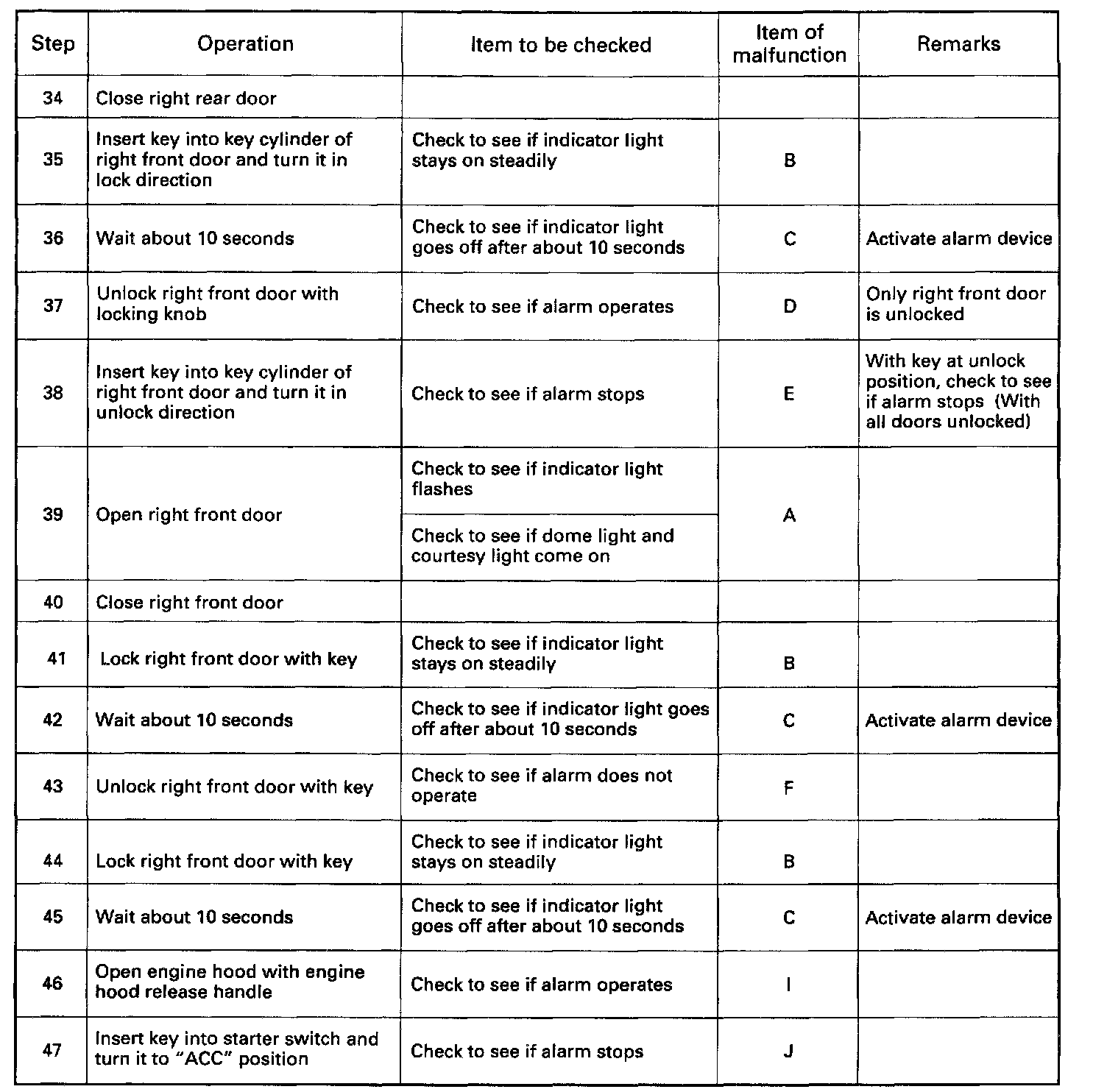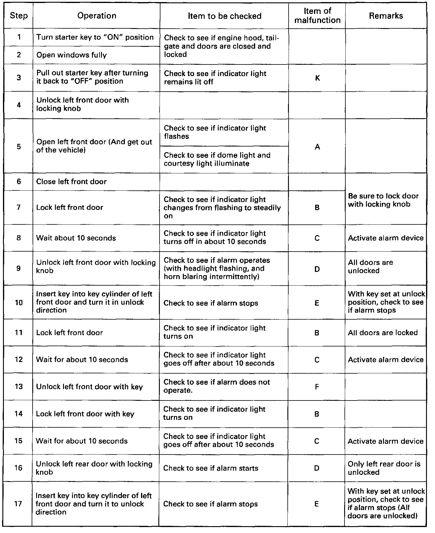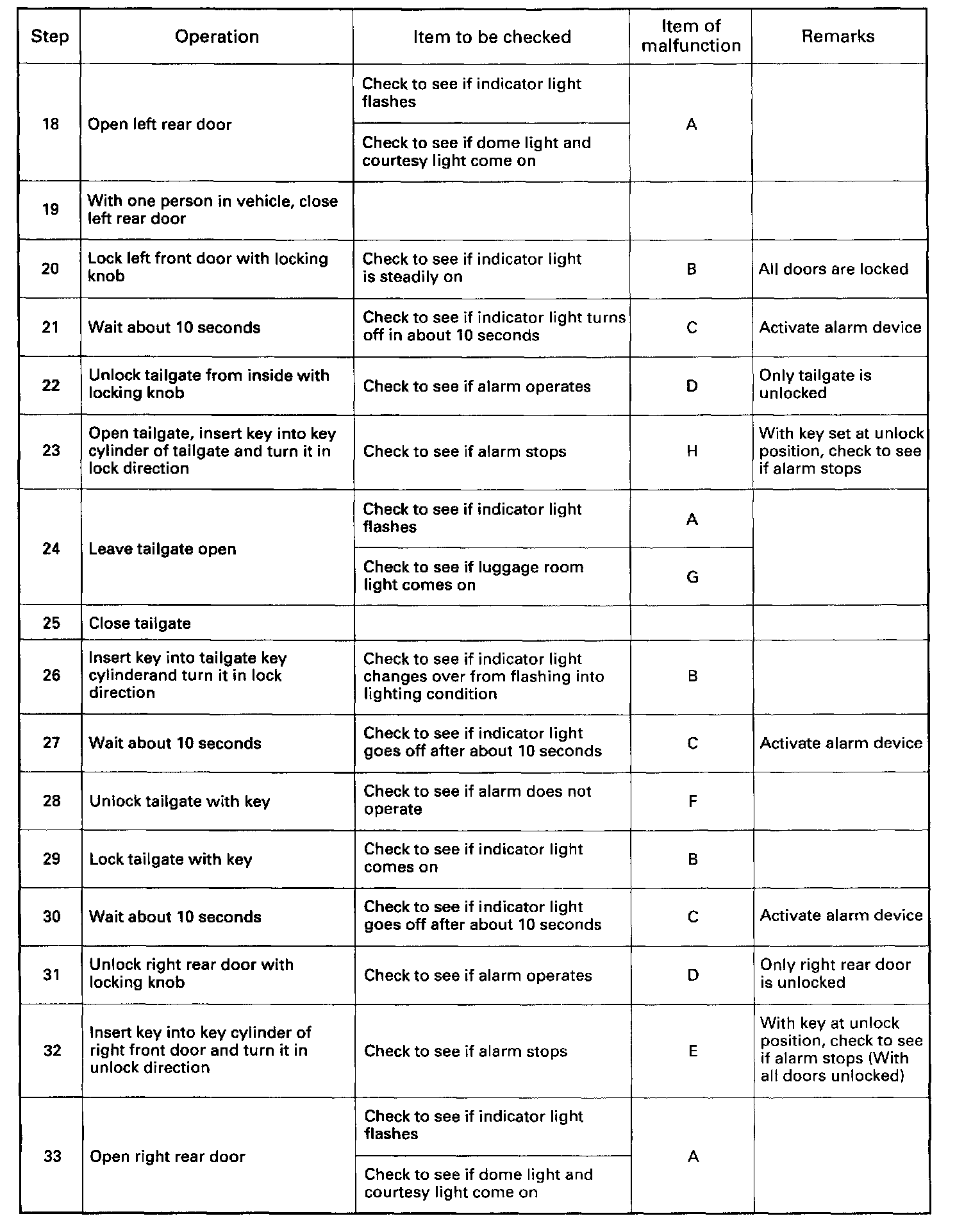 In the checking of short wheel base model, Step Nos. 16 through 21 and Step Nos. 31 through 36 are omitted.