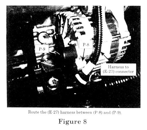^ Route the existing harness (leading to E-27 connector) in between the (P-8) and (P-9) connections and away from the exhaust manifold. (Figure 8)