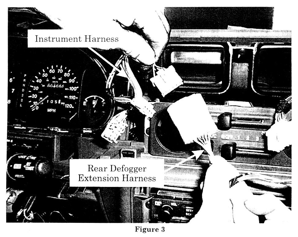 6. Route the loose end of the rear defogger extension harness down through the instrument panel assembly, along side the radio assembly, and out through the opening for the lower cluster assembly (figure 4).