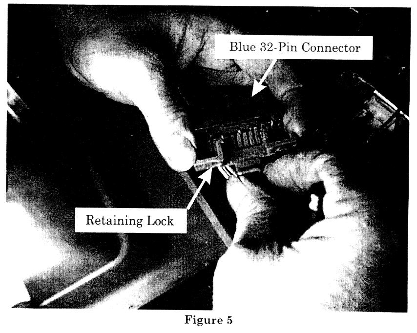 8. Disconnect the blue 32-pin connector from the back of the PCM and remove its grey retaining lock (figure 5). Insert the terminal of the yellow/green wire of the rear defogger extension harness into the vacant connector terminal F9 of the blue 32-pin connector (figure 6). Reinstall the gray retaining lock.